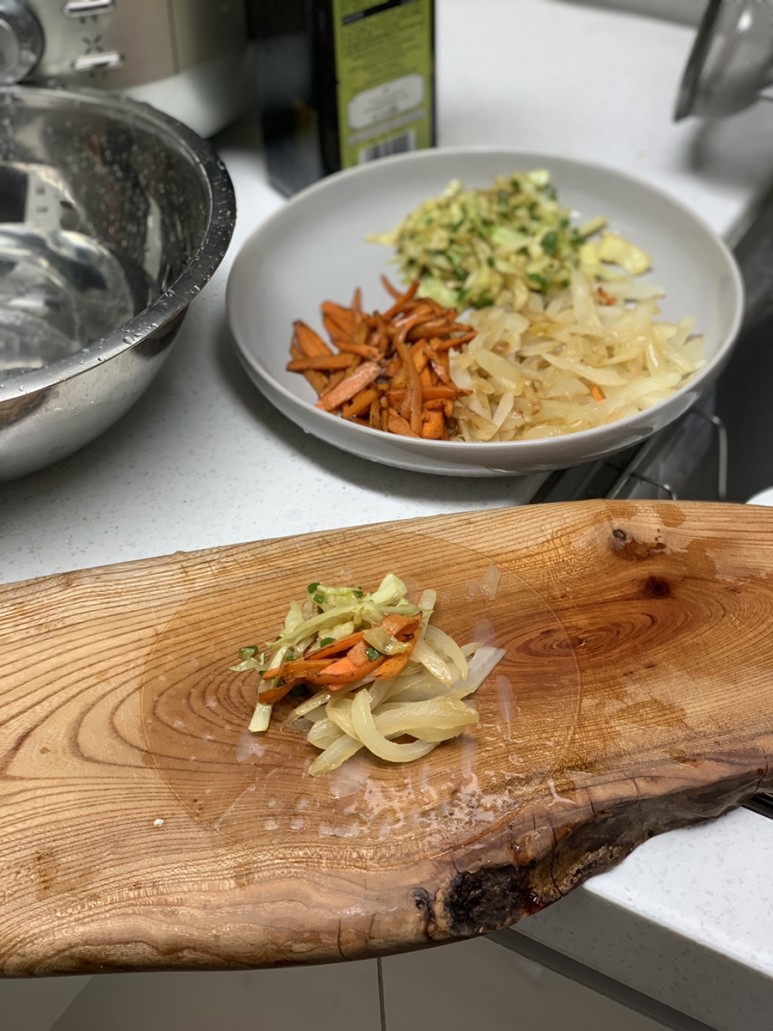 4. 라이스페이퍼에 물을 묻힌 후 고기/야채를 넣고 말아준다