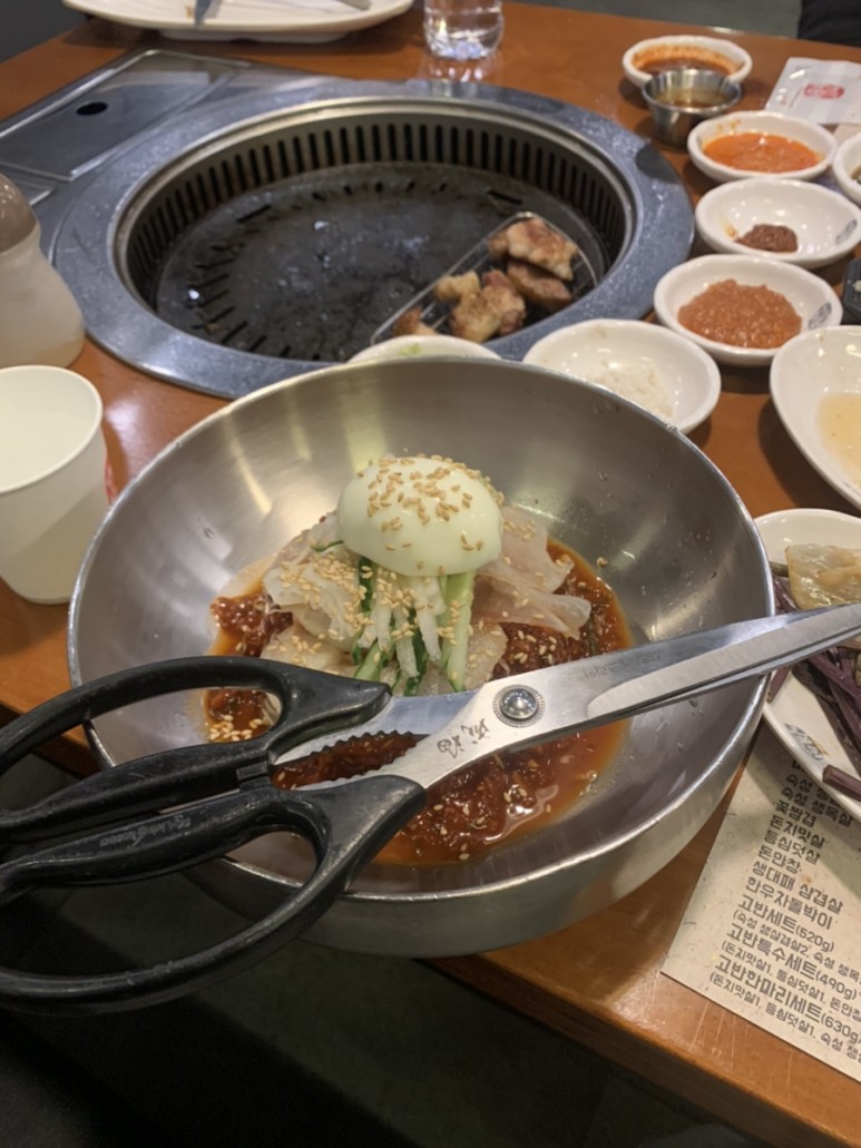 냉면에 고기 싸먹으니.. 천국이 여기입니다.